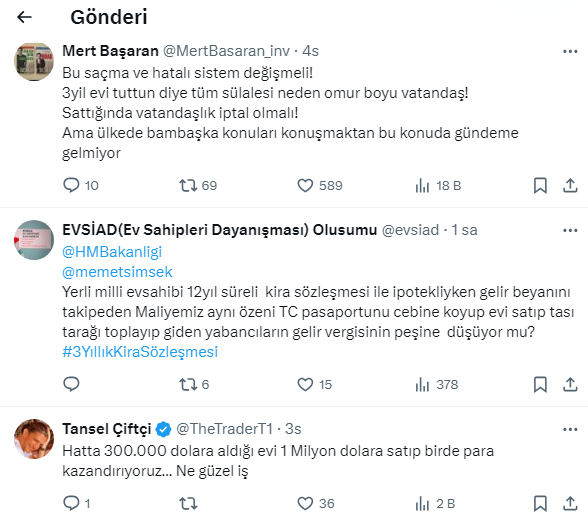 Ekonomist Mert Başaran, ülkemizde konut satın alarak, vatandaşlık alınmasına değindi. Yabancıları vatandaşlık alabilmek için konut satın aldıklarını söyleyen Başaran, 3 yıl sonra yabancıların bu evleri sattıklarına değinerek, ''Vatandaşlık yanına bonus kalıyor'' dedi. Başaran sosyal medya hesabı X'ten konuyla ilgili önemli değerlendirmelerde bulundu. Paylaşımın altına ise onlarca yorum geldi. İşte o paylaşım ve gelen yorumlar...