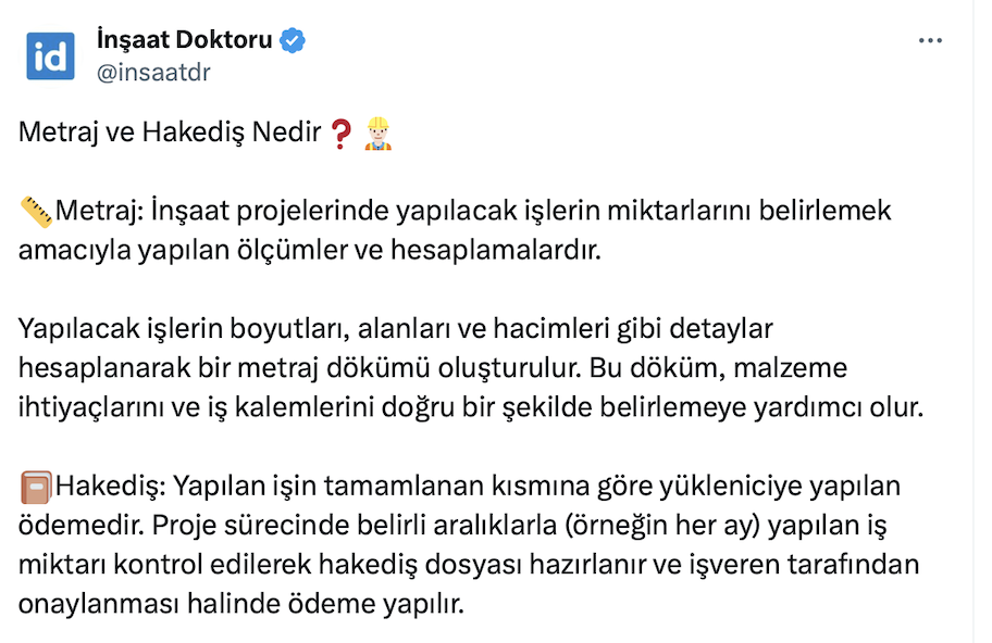 19,3 bin takipçili İnşaat Doktoru resmi X hesabı https://twitter.com/insaatdr üzerinden yaptığı paylaşımda metraj ve hakediş kavramlarını anlattı.