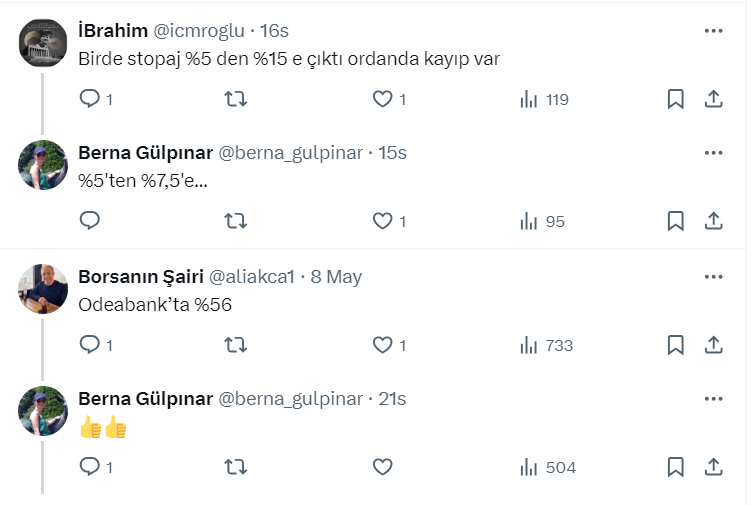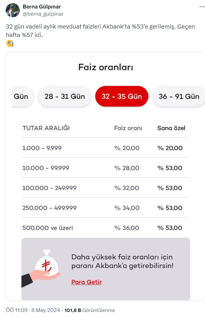 Çevirmen Berna Gülpınar X sosyal medya hesabı https://twitter.com/berna_gulpinar üzerinden yaptığı paylaşımda 32 gün vadeli aylık mevduat faizlerinin Akbank'ta yüzde 53'e gerilediğini belirterek geçen hafta yüzde 57 olduğunu söyledi.