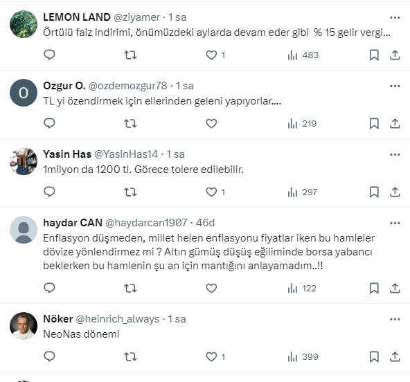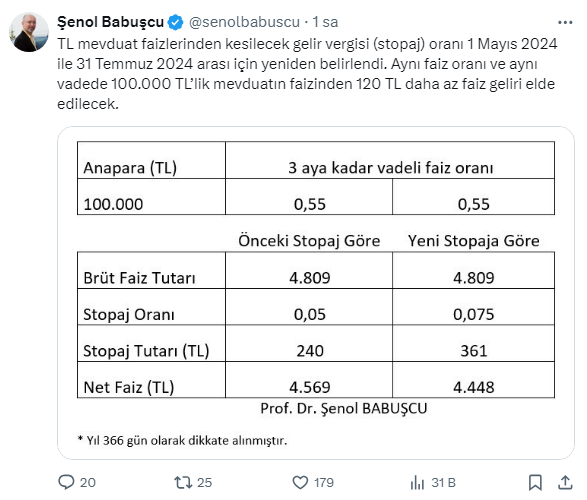 Mevduat faizlerinden kesilecek gelir vergisi 1 Mayıs'tan itibaren değişti. Mevduat faizinden kesilecek gelir vergisi 1 Mayıs 2024 ile 31 Temmuz 2024 arası için yeniden belirlendi. 100 bin TL'nin bugünden itibaren aylık geliri tam bu kadar olacak. Ekonomist Şenol Babuşçu sosyal medya hesabı X'ten 100 bin TL'nin aylık gelirini hesapladı. İşte o paylaşım ve gelen yorumlar...