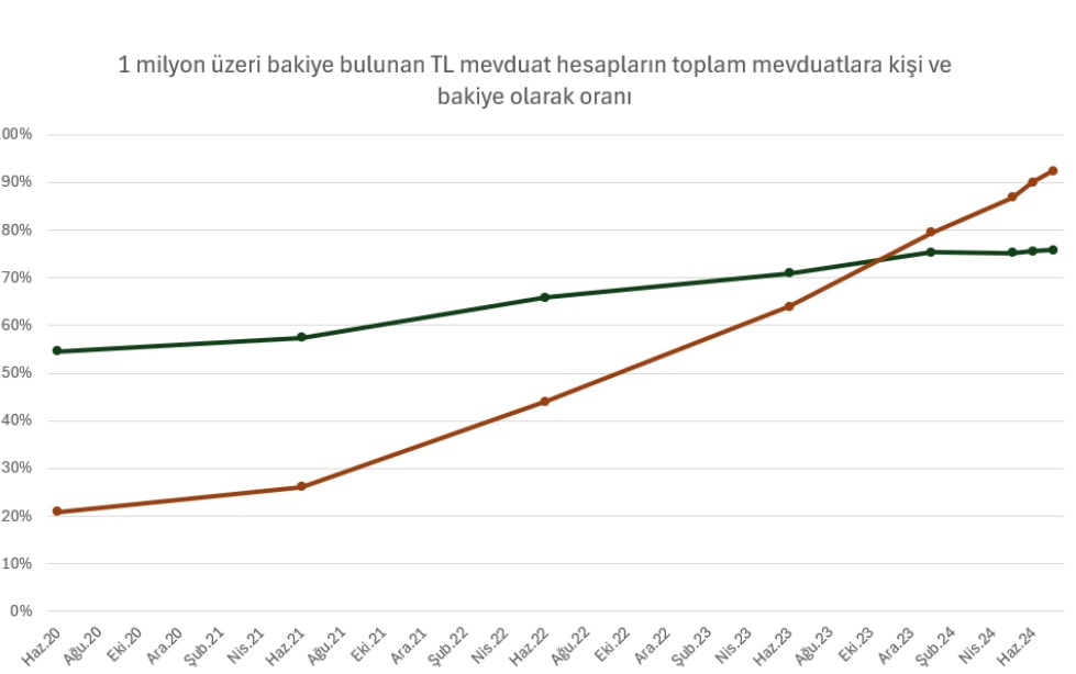 Bankalarda bulunan 1 milyon TL ve üzeri TL mevduat hesaplarında kişi sayısı, toplam mevduat sahiplerine oranı yüksek bir artış gösteriyor. Haziran 2020’de toplam mevduatlar içinde 1 milyon üzerinde olan hesaba sahip kişiler yüzde 21 olurken, Haziran 2024’te yüzde 92 oluyor. Hesap bakiyelerinde ise toplam mevduatların içinde 1 milyon TL ve üzeri mevduata sahip bakiye oranı aynı sürede yüzde 55’ten yüzde 76’ya kadar artıyor.