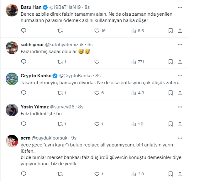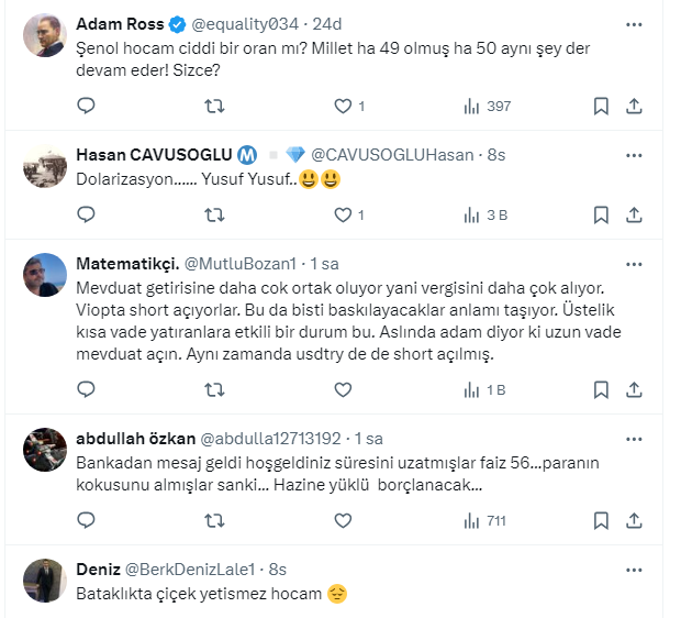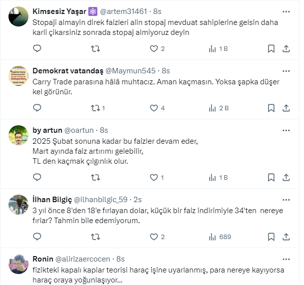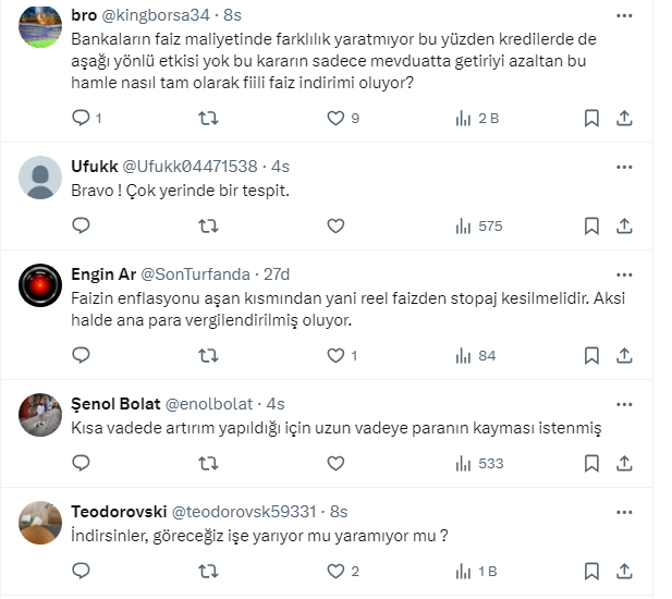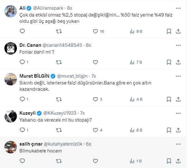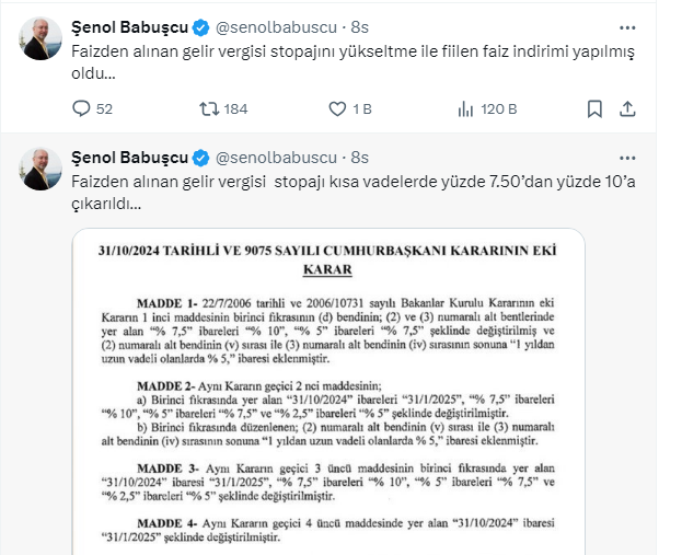 Kararın Resmi Gazete’de yayınlanmasının ardından Ziraat Bankası eski Genel Müdür Yardımcısı ve Başkent Üniversitesi Uluslararası Finans ve Bankacılık Bölüm Başkanı Prof. Dr. Şenol Babuşcu https://x.com/senolbabuscu X sosyal medya hesabından yaptığı paylaşımda, “Faizden alınan gelir vergisi stopajı kısa vadelerde yüzde 7.50’dan yüzde 10’a çıkarıldı… Faizden alınan gelir vergisi stopajını yükseltme ile fiilen faiz indirimi yapılmış oldu…” dedi.