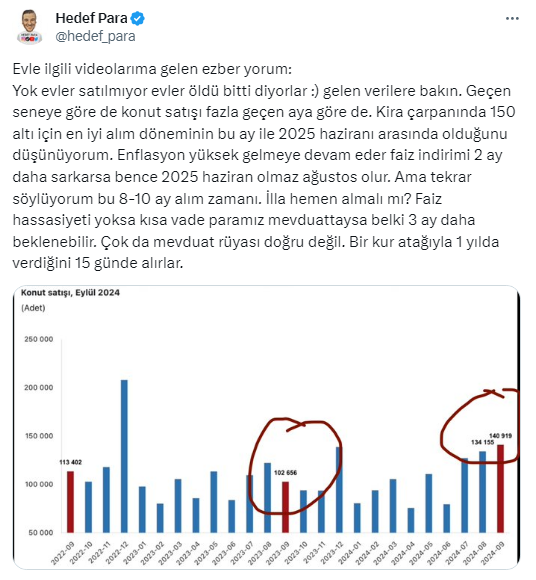 Yok evler satılmıyor evler öldü bitti diyorlar :) gelen verilere bakın. Geçen seneye göre de konut satışı fazla geçen aya göre de. Kira çarpanında 150 altı için en iyi alım döneminin bu ay ile 2025 haziranı arasında olduğunu düşünüyorum. Enflasyon yüksek gelmeye devam eder faiz indirimi 2 ay daha sarkarsa bence 2025 haziran olmaz ağustos olur. Ama tekrar söylüyorum bu 8-10 ay alım zamanı. İlla hemen almalı mı? Faiz hassasiyeti yoksa kısa vade paramız mevduattaysa belki 3 ay daha beklenebilir. Çok da mevduat rüyası doğru değil. Bir kur atağıyla 1 yılda verdiğini 15 günde alırlar.