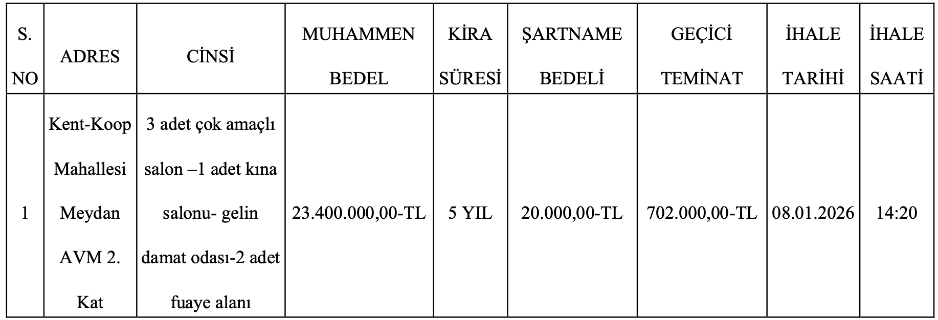 1- Aşağıda kira süresi, muhammen bedeli, geçici teminatı, ihale tarihi ve saati belirtilen, Mülkiyeti Belediyemize ait, Kent Koop Mahallesi 61004 ada 2 parselde bulunan Batıkent Meydan AVM’ nin 2. Katında bulunan 3 adet çok amaçlı salon, 1 adet kına salonu, gelin-damat odası, 2 adet fuaye alanı, 2886 sayılı Devlet İhale Kanunun 36. maddesi gereğince “Kapalı teklif usulü” ile kiraya verilecektir.