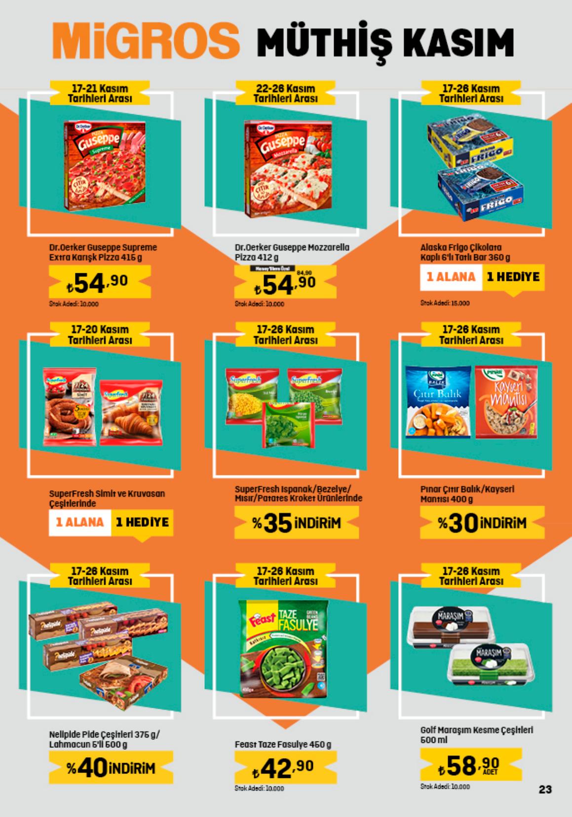 16 Kasım-29 Kasım tarihlerinde geçerli olacak indirimli ürünlerini paylaşan Migros, tüm müşterilerini şubelerine davet etti. Buna göre, Migros’ta tuvalet kâğıdından sucuğa, bebek bezinden pizzaya kadar birçok ürün indirime girdi.