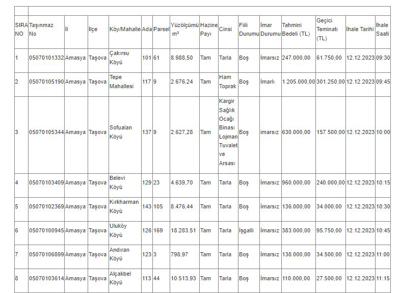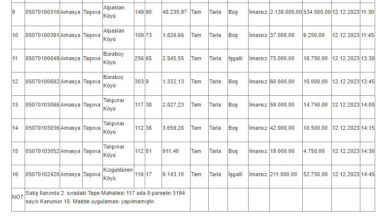 Amasya ili, Taşova ilçesinde tarla vasfındaki 16 adet arazi satışa çıkarıldı. Söz konusu arazilerin muhtelif köy ve mahallelerde yer aldığı belirtildi.