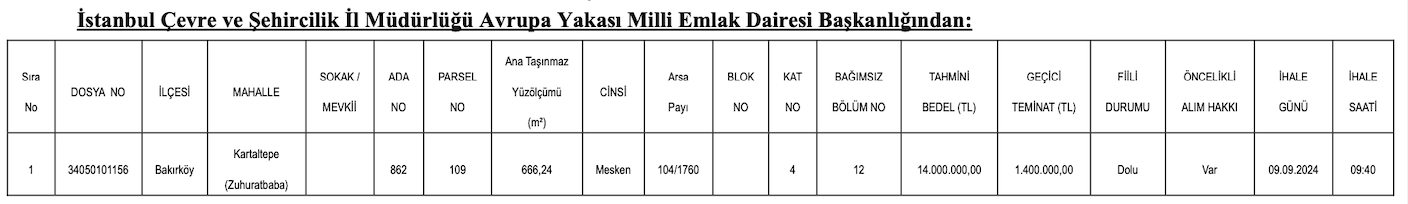 Bakırköy Kartaltepe’de yer alan konutun muhammen bedeli 14 milyon TL olarak, geçici teminat bedeli de 1 milyon 400 bin TL olarak açıklandı. Söz konusu satış ihalesi 9 Eylül 2024 tarihinde gerçekleştirilecek.