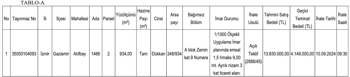 İzmir Gaziemir Atıfbey Mahallesi’nde yer alan iş yerinin ise muhammen bedeli 13 milyon 830 bin TL olarak açıklanırken, geçici teminat bedeli de 4 milyon 149 bin TL olarak açıklandı.