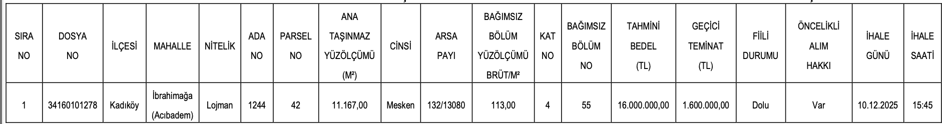 113 metrekare alana sahip mesken, İbrahimağa Mahallesi’nde yer alıyor. Söz konusu meskenin tahmini bedeli 16 milyon TL olarak açıklanırken, geçici teminat bedeli ise 1 milyon 600 bin TL olarak açıklandı.