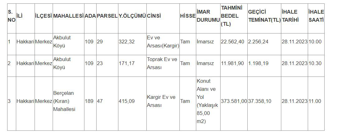 1-) Yukarıda tapu bilgileri yazılı 3 adet taşınmazın satış ihalesi, 2886 sayılı Devlet İhale Kanununun 45. Maddesine göre Açık Teklif Usulü ile ilan metninde belirtilen tarih ve saatte Hakkari Milli Emlak Müdürlüğü Makam odasında teşekkül edecek komisyon huzurunda yapılacaktır.
