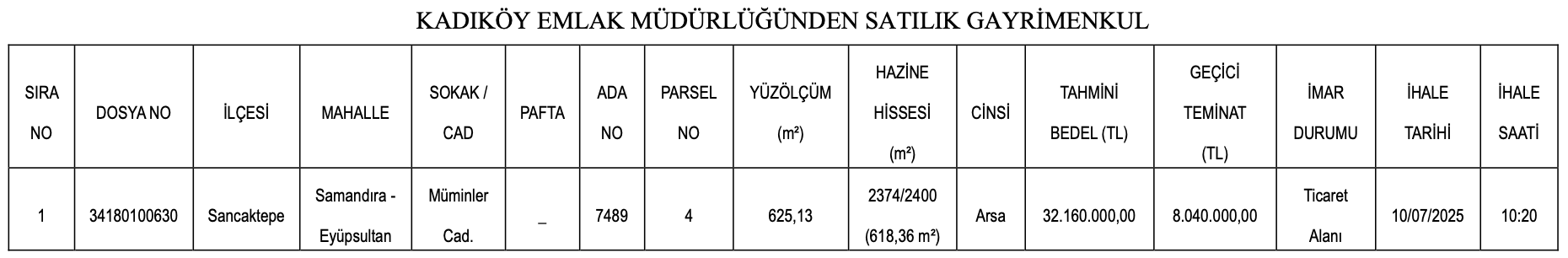 TAŞINMAZ SATILACAKTIR İstanbul Çevre, Şehircilik ve İklim Değişikliği İl Müdürlüğü Anadolu Yakası Milli Emlak Dairesi Başkanlığından: