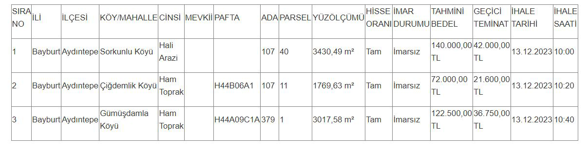 Bayburt ili, Aydıntepe ilçesine bağlı Sorkunlu, Çiğdemlik ve Gümüşdamla köylerinde yer alan 3 adet arazi Mlli Emlak Şefliği tarafından satışa çıkarıldı. Söz konusu araziler için 13 Aralık 2023 Çarşamba günü saat 10.00 ile 10.40 arasında açık teklif usulüyle ihale düzenlenecek.