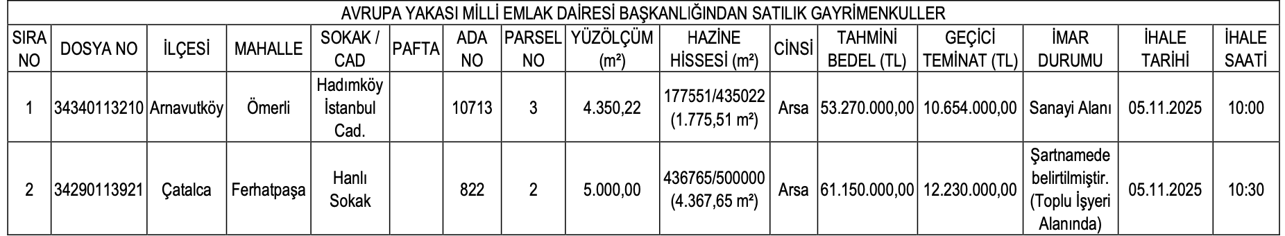 İstanbul Çevre, Şehircilik ve İklim Değişikliği İl Müdürlüğü Avrupa Yakası Milli Emlak Dairesi Başkanlığı, İstanbul Arnavutköy ve Çatalca’da yer alan arsalar için satış ihalesi düzenliyor. Söz konusu arsaların yüz ölçümleri 4 bin 250,22 metrekare ve 5 bin metrekare olarak açıklandı.