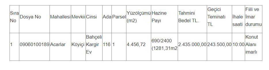 Aydın iline bağlı İncirliova Milli Emlak Şefliği, bahçeli kargir ev satışı yapacak. Evin Acarlar Mahallesi’nde olduğu ve 29 Kasım 2023 Çarşamba günü saat 10.00’da açık teklif usulüyle ihale yapılacağı öğrenildi.