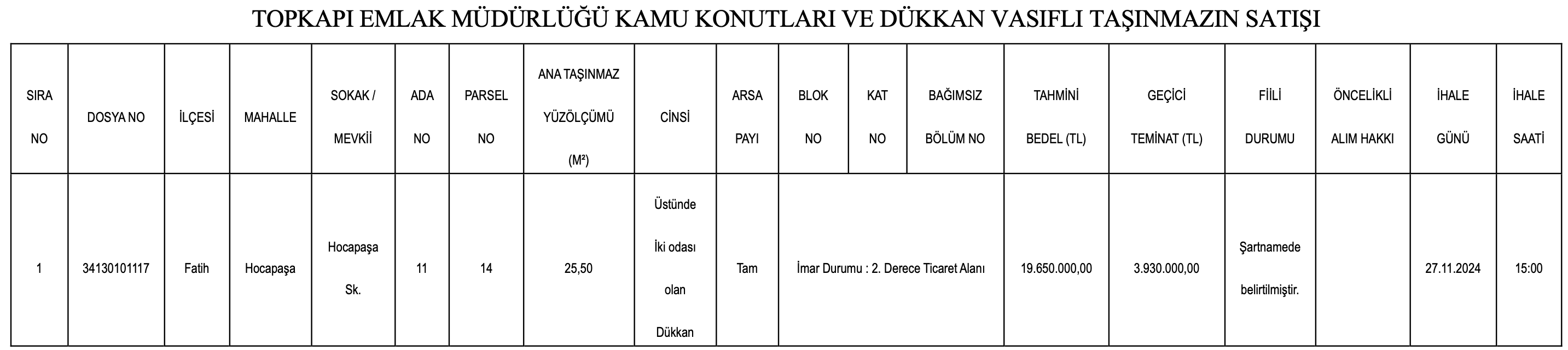 Hocapaşa Mahallesi, Hocapaşa Sokak’ta yer alan iş yerinin satış ihalesi 27 Kasım 2024 tarihinde saat 15.00’te İstanbul Çevre, Şehircilik ve İklim Değişikliği İl Müdürlüğü Avrupa Yakası Milli Emlak Dairesi Başkanlığı’nda yapılacak.