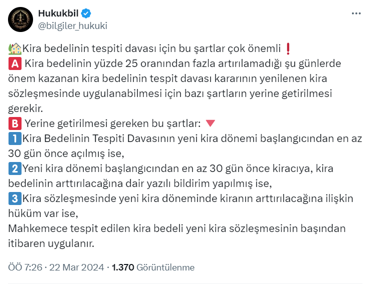 Sosyal medya üzerinden yaptığı paylaşımlarla dikkat çeken 8 bin 191 takipçili Hukukbil isimli kullanıcı resmi sosyal medya hesabı https://twitter.com/bilgiler_hukuki üzerinden kira bedelinin tespiti davası için önemli olan 3 şartı açıkladı.