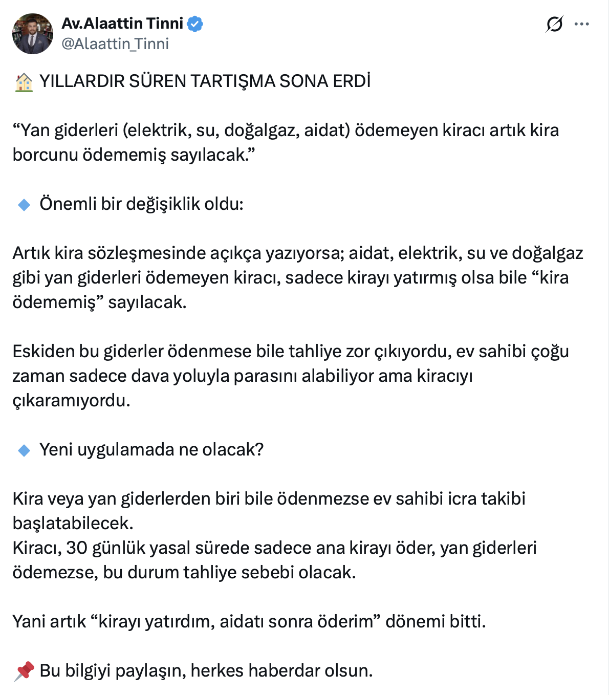 Ev sahibi ve kiracılar ile ilgili paylaşımlarla dikkat çeken Avukat Alaattin Tinni resmi sosyal medya hesabı https://x.com/Alaattin_Tinni üzerinden yaptığı paylaşımda yan giderleri (elektrik, su, doğalgaz, aidat) ödemeyen kiracıların artık kira borcunu ödememiş sayılacağını söyledi.