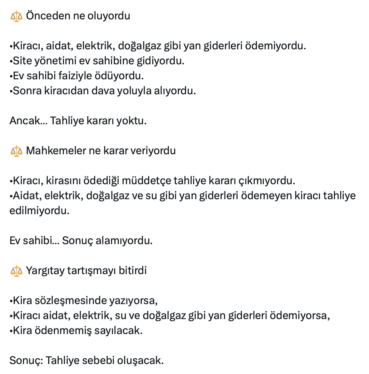 Artık kira sözleşmesinde açıkça yazıyorsa; aidat, elektrik, su ve doğalgaz gibi yan giderleri ödemeyen kiracı, sadece kirayı yatırmış olsa bile “kira ödememiş” sayılacak.