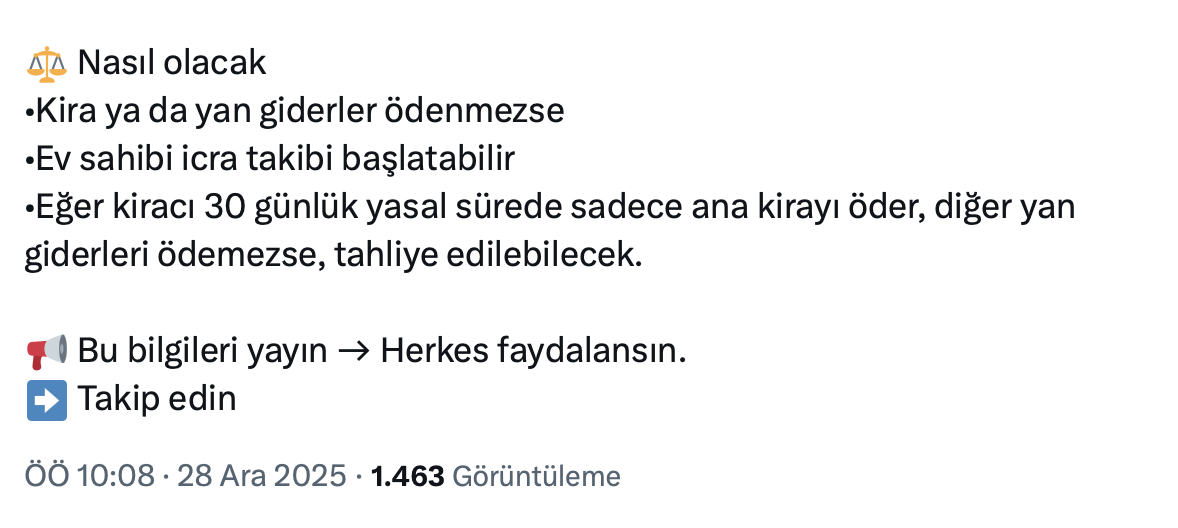 •Eğer kiracı 30 günlük yasal sürede sadece ana kirayı öder, diğer yan giderleri ödemezse, tahliye edilebilecek.