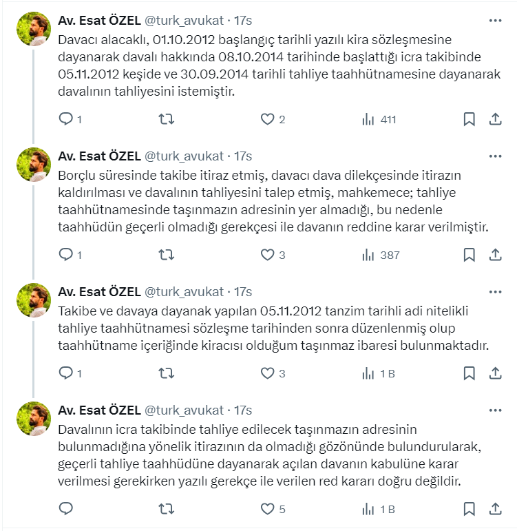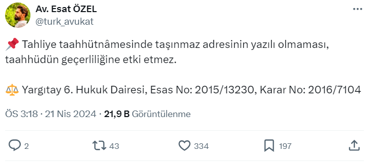 Ev sahipleri ve kiracıların en çok merak ettiği konular ile ilgili olarak yaptığı paylaşımlarla dikkat çeken Avukat Esat Özel resmi X hesabı https://twitter.com/turk_avukat üzerinden yaptığı paylaşımda tahliye taahhütnâmesinde taşınmaz adresinin yazılı olmamasının taahhüdün geçerliliğine etki etmeyeceğini belirtti.