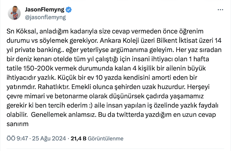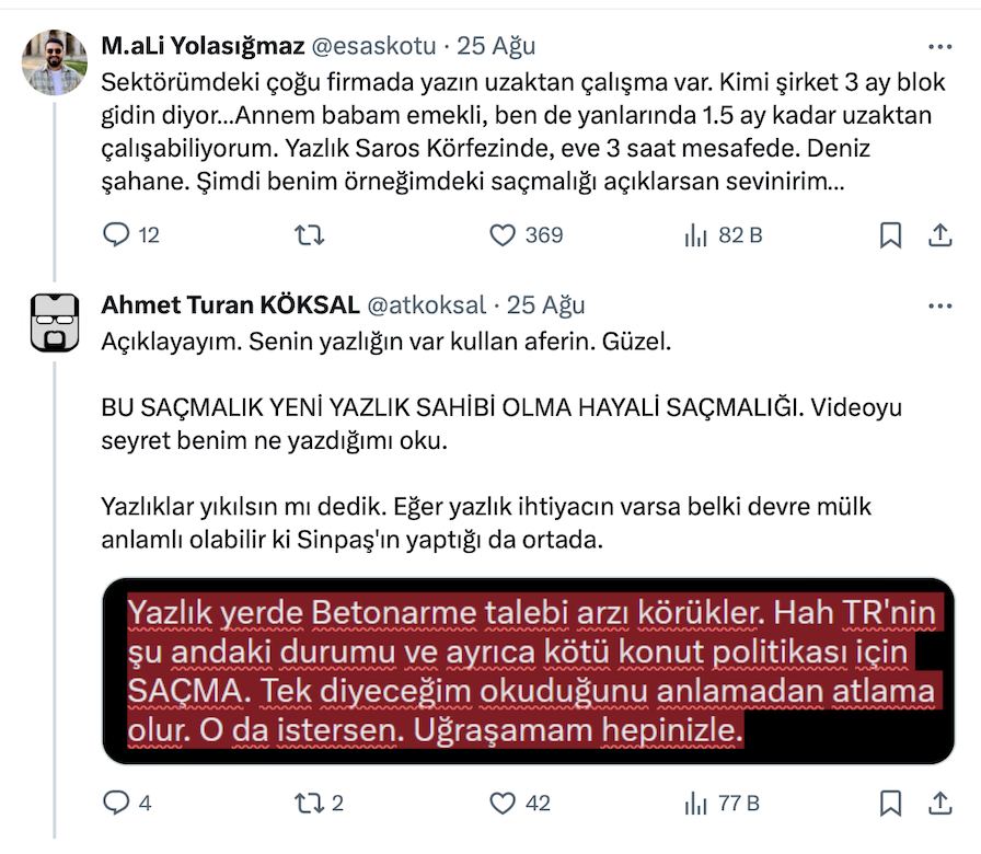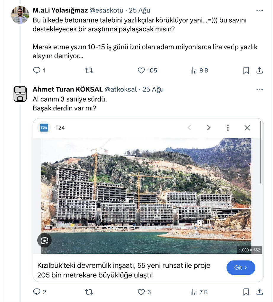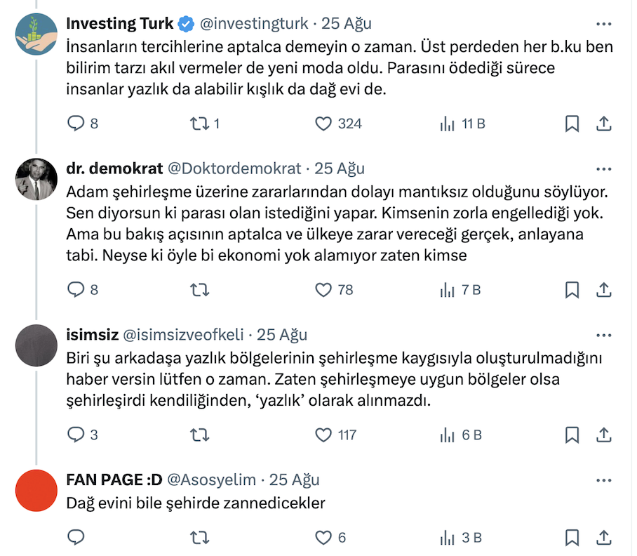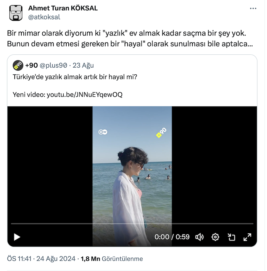 +90’ın ‘Türkiye’de yazlık almak artık bir hayal mi?’ paylaşımını alıntılayan Mimar Ahmet Turan Köksal resmi X hesabı https://x.com/atkoksal üzerinden yaptığı paylaşımda “Bir mimar olarak diyorum ki "yazlık" ev almak kadar saçma bir şey yok. Bunun devam etmesi gereken bir "hayal" olarak sunulması bile aptalca…” ifadelerini kullandı.