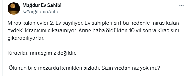 ''Miras kalan evler 2. Ev sayılıyor. Ev sahipleri sırf bu nedenle miras kalan evdeki kiracısını çıkaramıyor. Anne baba öldükten 10 yıl sonra kiracısını çıkarabiliyorlar. Kiracılar, mirasçımız değildir. Ölünün bile mezarda kemikleri sızladı. Sizin vicdanınız yok mu?''