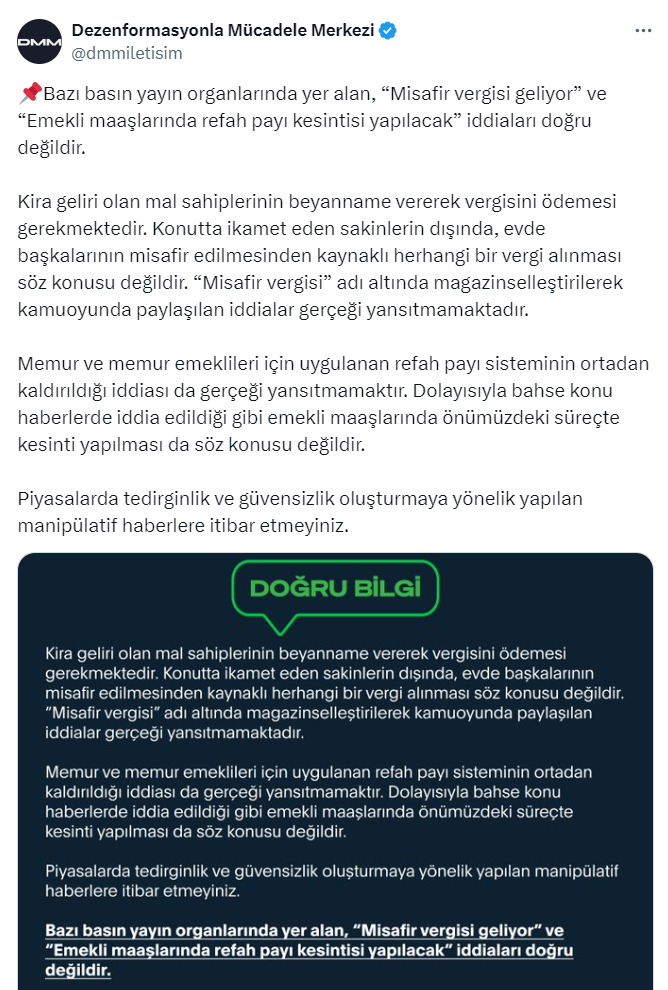 Dezenformasyonla Mücadele Merkezi (DMM) "Misafir vergisi geliyor" ve "Emekli maaşlarında refah payı kesintisi yapılacak" iddiaları ile ilgili açıklama yaptı.