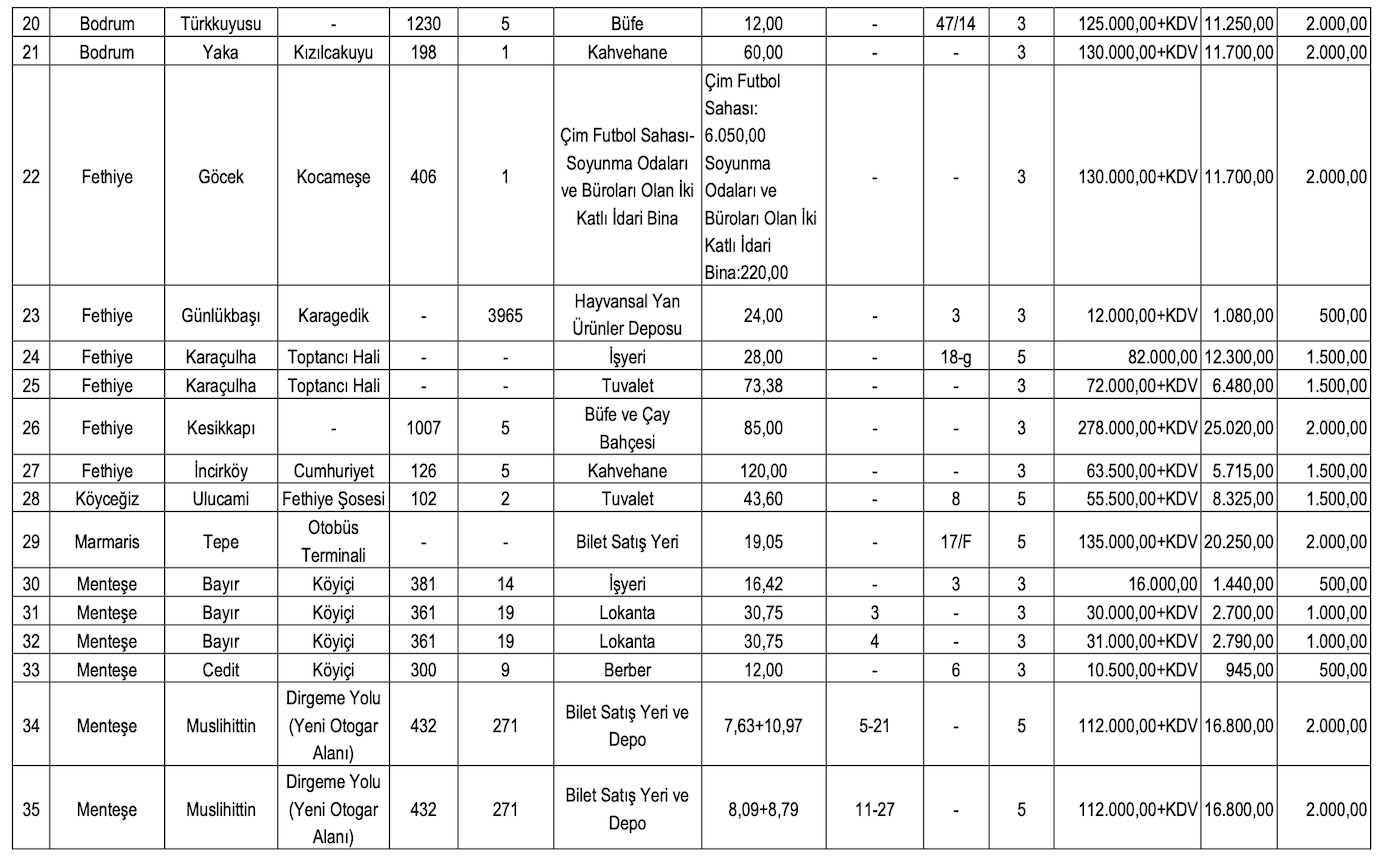 1. Muğla Büyükşehir Belediye Başkanlığının mülkiyeti, yönetimi ve tasarrufu altında bulunan, aşağıda nitelikleri, kira süreleri, yıllık tahmini kira ve