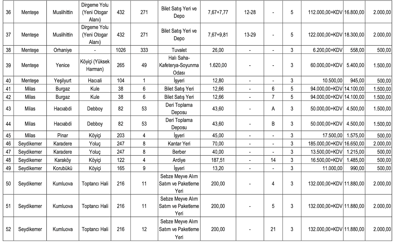 Muğla Büyükşehir Belediye Başkanlığı, Muğla’da yer alan 61 adet gayrimenkulü kiraya verecek. Kiraya verilecek gayrimenkuller Bodrum, Fethiye, Köyceğiz, Menteşe, Milas, Seydikemer, Ula ve Yatağan’da yer alıyor.