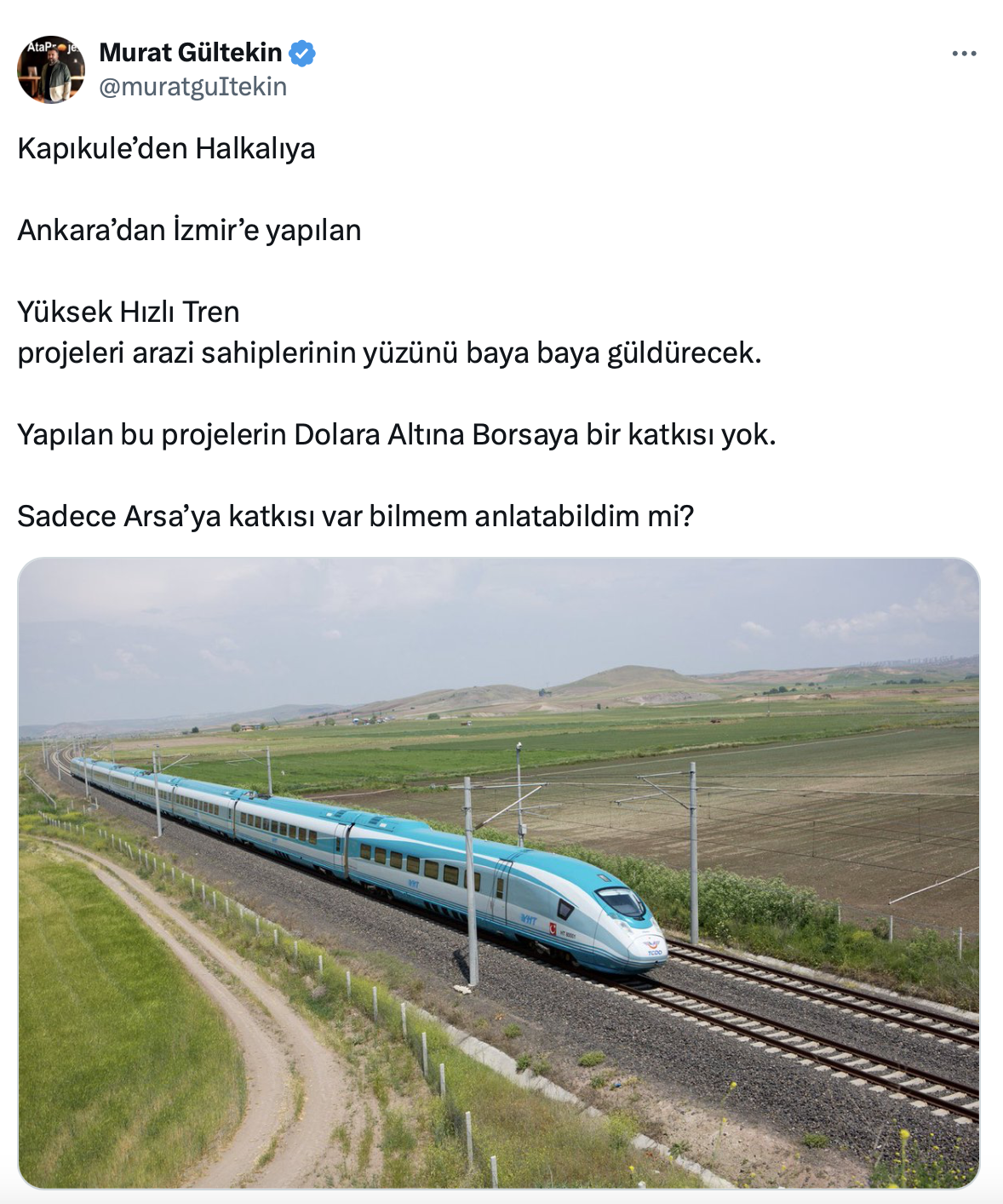 Gayrimenkul Uzmanı Murat Gültekin resmi sosyal medya hesabı https://x.com/muratguItekin üzerinden yaptığı paylaşımda Kapıkule’den Halkalıya, Ankara’dan İzmir’e yapılan YHT projelerinin arazi sahiplerinin yüzünü güldüreceğini açıkladı.