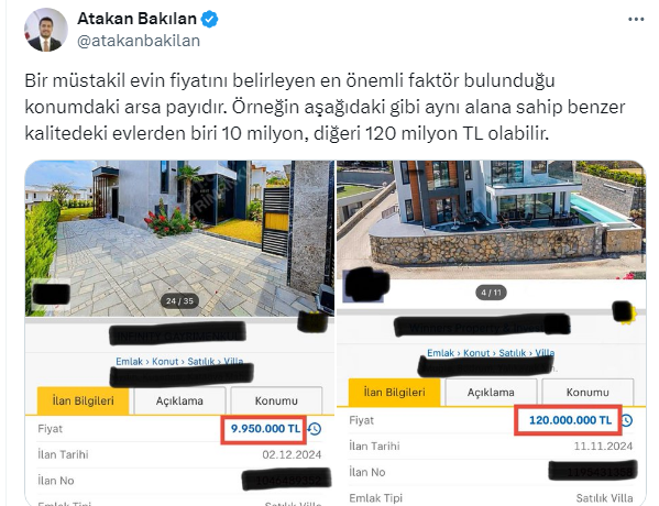 Benzer özellik ve kalitedeki evlerin farklı fiyatlara satıldığını bunun ise tek farkının konumdaki arsa payı olduğunu söyleyen Atakan Bakılan, aradaki uçurumu sosyal medya hesabından şöyle paylaştı: