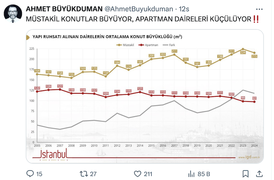 Gayrimenkul Değerleme Uzmanı Dr. Ahmet Büyükduman resmi X hesabı https://x.com/AhmetBuyukduman üzerinden yaptığı paylaşımda, müstakil konutların büyüdüğünü, apartman dairelerinin küçüldüğünü belirtti.