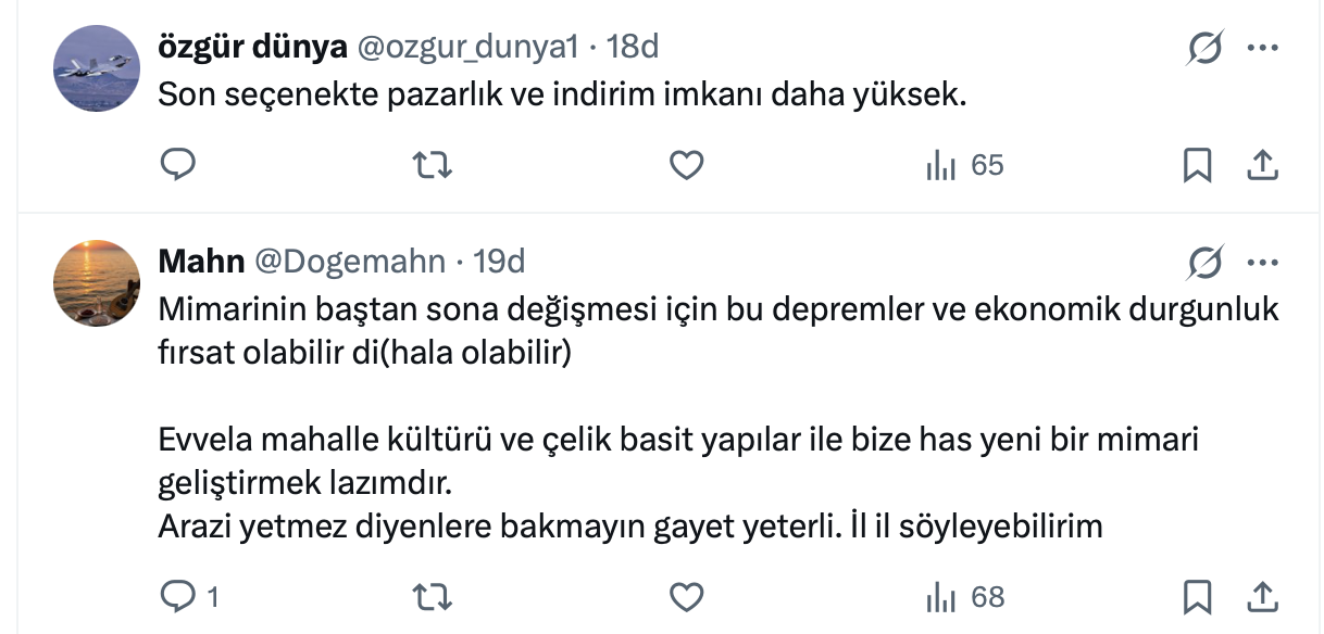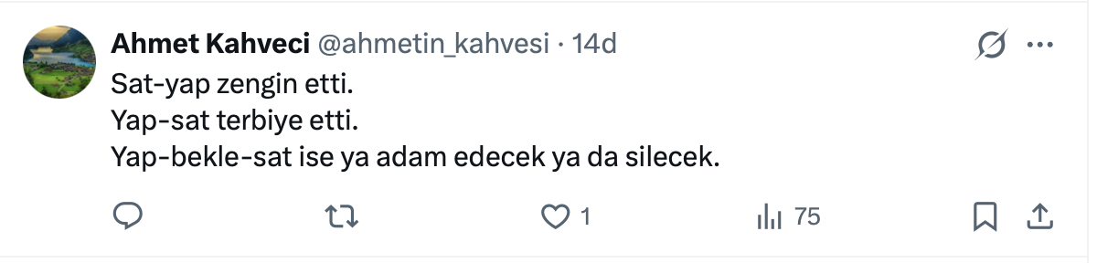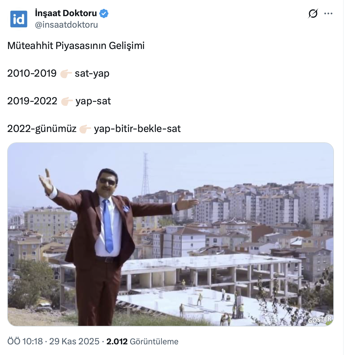 İnşaat Doktoru paylaşımında “ 2010-2019 sat-yap, 2019-2022 yap-sat, 2022-günümüz yap-bitir-bekle-sat” ifadelerini kullandı.