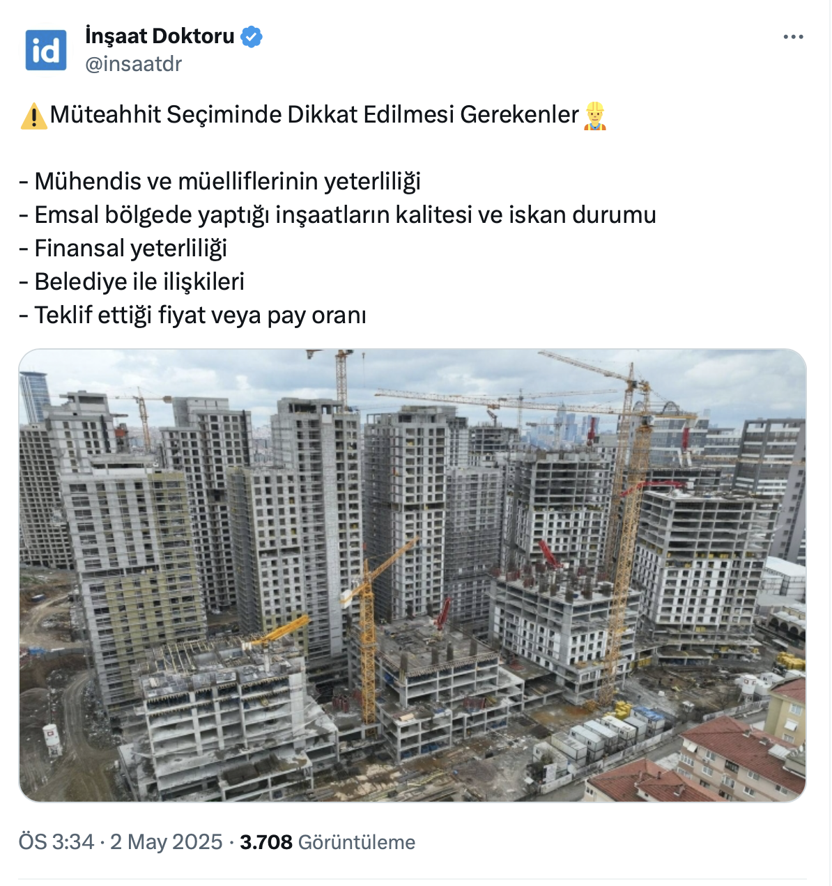 44,5 bin takipçili İnşaat Doktoru resmi X hesabı https://twitter.com/insaatdr üzerinden yaptığı paylaşımda müteahhit seçerken dikkat edilmesi gerekenleri açıkladı.