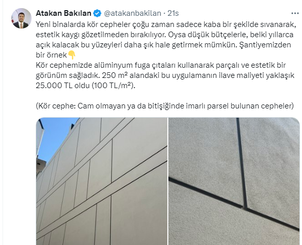 Yeni binalarda, cephe görüntüleri vatandaşları rahatsız ediyor. Ön cepheler, özenli ve gösterişli olurken, kör cephelerin sadece bir sıva ile bırakılması tepkilere neden oluyor. Bir çok müteahhit, yeni binalarda kör cephelerden kaçıyor. İnşaat Mühendisi Atakan Bakılan, sosyal medya hesabından, düüşük maliyetle bu cephelerin şık hale gelebileceğini söyleyerek müteahhitlere çağrıda bulundu.