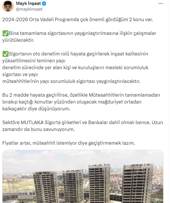 Akademisyen İnşaat Mühendisi Mayk İnşaat, sosyal medya hesabından, inşaat projelerini yarıda bırakam mütehhitler için çösüm önerisi geldi. Mayk İnşaat, 2024-2026 Orta Vadeli Programda çok önemli gördüğü iki konuya değindi. Bina tamamlama sigortasının yaygınlaştırılmasına yönelik çalışmaların yürütülmesine ve denetim şartının olması gerektiğine vurgu yaptı. Mayk İnşaat sosyal medya hesbaı X'ten yaptığı paylaşımda, bu iki maddenin önemine vurgu yaparak ''Fiyatlar artar, müteahhit istemiyor diye geçiştirmemek lazım.'' dedi. İşte Mayk İnşaat'ın o paylaşımı ve vatandaşlardan gelen yorumlar...