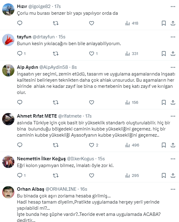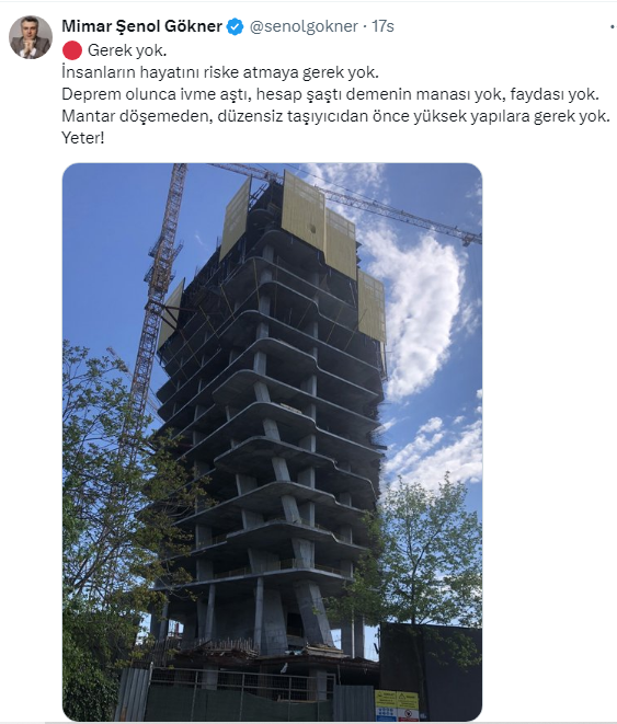 Mimar Şenol Gökner, sosyal medya hesabı X'ten bir yeni yapılan yüksek katlı bir binanın fotoğrafını paylaştı. Binanın yüksekliği dikkatleri çekerken, asıl korkutan detay kolonların çarpık yapılması. İnsanların hayatını hiçe sayarcasına yapılan bu bina görenleri korkuttu. Mimar, Gökner fotoğraf karşısında '' insanların hayatını riske atmaya gerek yok'' diyerek isyan etti. İşte o paylaşım ve gelen yorumlar....