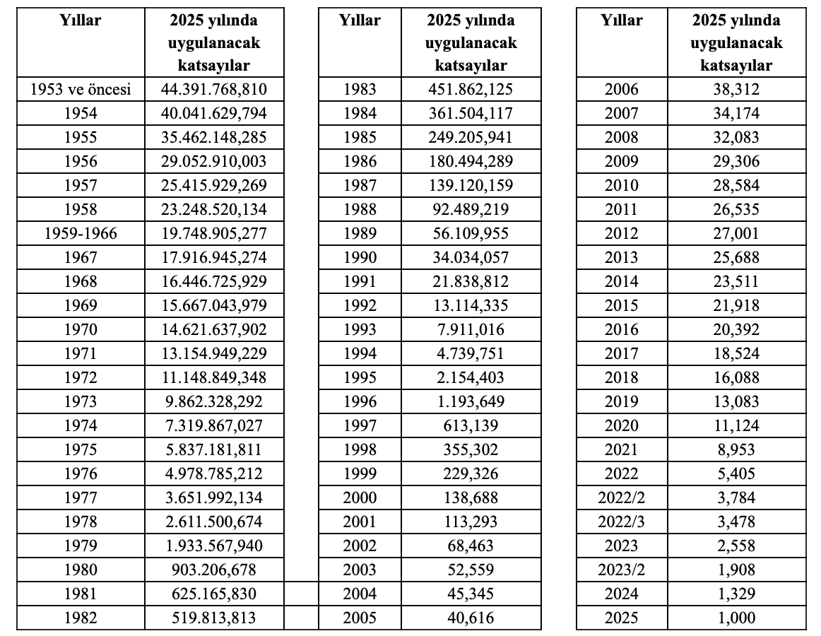 MADDE 2- (1) 1/1/2025 tarihinden itibaren, müteahhitlik karneleri ve iş bitirme belgeleri için geçerli katsayılar aşağıda belirtilmiştir: