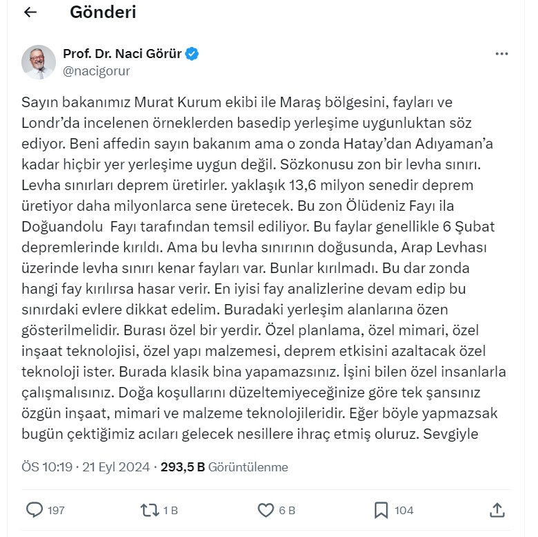 Yer bilimci Prof. Dr. Naci Görür "Sayın bakanımız Murat Kurum ekibi ile Maraş bölgesini, fayları ve Londr’da incelenen örneklerden basedip yerleşime uygunluktan söz ediyor. Beni affedin sayın bakanım ama o zonda Hatay’dan Adıyaman’a kadar hiçbir yer yerleşime uygun değil. Sözkonusu zon bir levha sınırı. Levha sınırları deprem üretirler. Yaklaşık 13,6 milyon senedir deprem üretiyor daha milyonlarca sene üretecek." dedi.