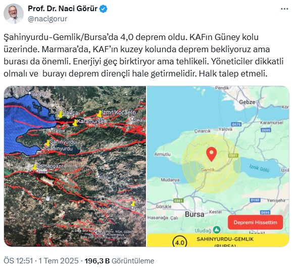 Görür meydana gelen depremle ilgili şu ifadeleri kullandı: ''Şahinyurdu-Gemlik/Bursa’da 4,0 deprem oldu. KAFın Güney kolu üzerinde. Marmara’da, KAF’ın kuzey kolunda deprem bekliyoruz ama burası da önemli. Enerjiyi geç birktiryor ama tehlikeli. Yöneticiler dikkatli olmalı ve burayı deprem dirençli hale getirmelidir. Halk talep etmeli.''