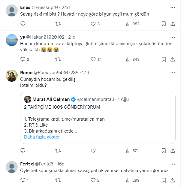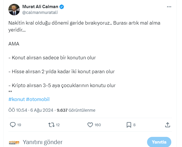 Son dönemlerde konut fiyatlarının fahiş rakamlara ulaşması ile vatandaşlar konut alamaz oldu. Konut hayali bile kuramaz hale gelen yatırımcılar, konut sahibi olabilmenin yöntemlerini araştırıyor. Kripto fenomeni Murat Ali Calman, konuyla ilgili yatırımcıları uyardı. Calman, naktin kral olduğu dönemina artık sona ereceğini, mal sahibi olma döneminin başladığını açıkladı. Calman özellikle konut yatırımı yapmak isteyenleri uyardı.