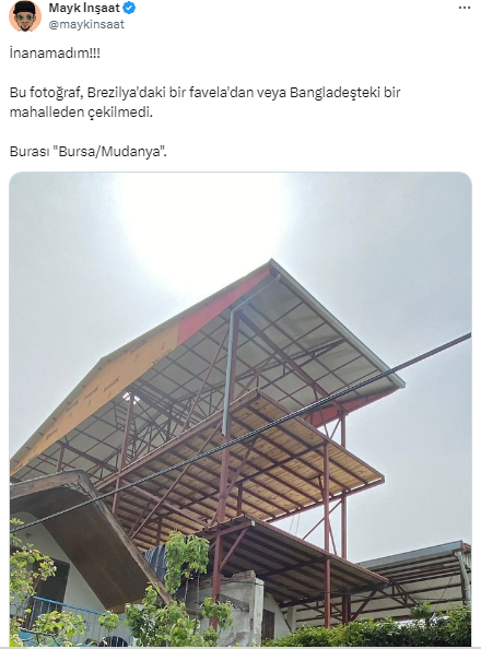 Ülkenin dört bir yanından imar kanununu görmezden gelen farklı, yaratıcı, komik ve asıl önemli olan tehlikeli evler yapılmaya devam ediyor. Bunlardan biri de Bursa'da. Bursa'da bir ev sahibi öyle bir ev yaptı ki, vatandaşlardan evle ilgili yorum yağmuru geldi. Ev adeta 'her an uçuşa hazır' durumda. Evi görenlerden gelen farklı yorumlar tebessüm ettirdi. Akademisyen İnşaat Mühendisi Mayk İnşaat, X sosyal medya hesabı üzerinden evin görselin paylaşarak değerlendirdi. İşte o paylaşım ve vatandaşlardan gelen yorumlar...