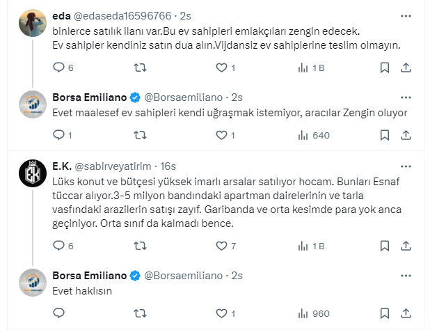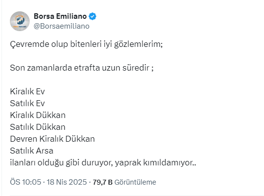 Sosyal medyanın da gündemine düşen bu gelişme, 57 bin takipçili yatırım yorumları ile bilinen Borsa Emiliano isimli kişiden geldi. Borsa Emiliano, son zamanlarda kiralık, satılık ev ve dükkanların ilanlarının olduğu gibi durduğunu söyledi. İşte o paylaşım ve vatandaşlardan gelen yorumlar....