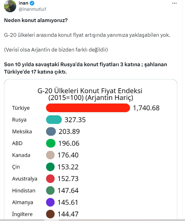 Türkiye'de konut fiyatları son 10 yılda 17 katına çıktı. İktisatçı İnan Mutlu, sosyal medya hesabı X'ten 'Neden konut alamıyoruz?' başlığı ile G-20 ülkeleri arasında Türkiye'deki konut fiyat artışını gözler önüne serdi.