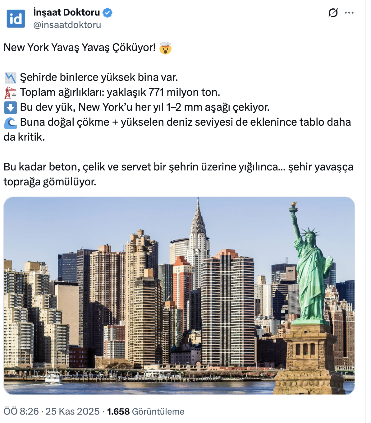 69,3 bin takipçili İnşaat Doktoru resmi sosyal medya hesabı üzerinden yaptığı paylaşımda New York’taki binlerce yüksek binanın ağırlığının 771 milyon ton olduğunu belirterek, bu dev yükün New York’u her yıl 1–2 mm aşağı çektiğini belirtti.