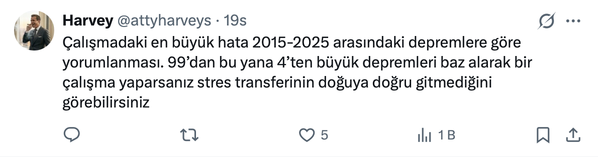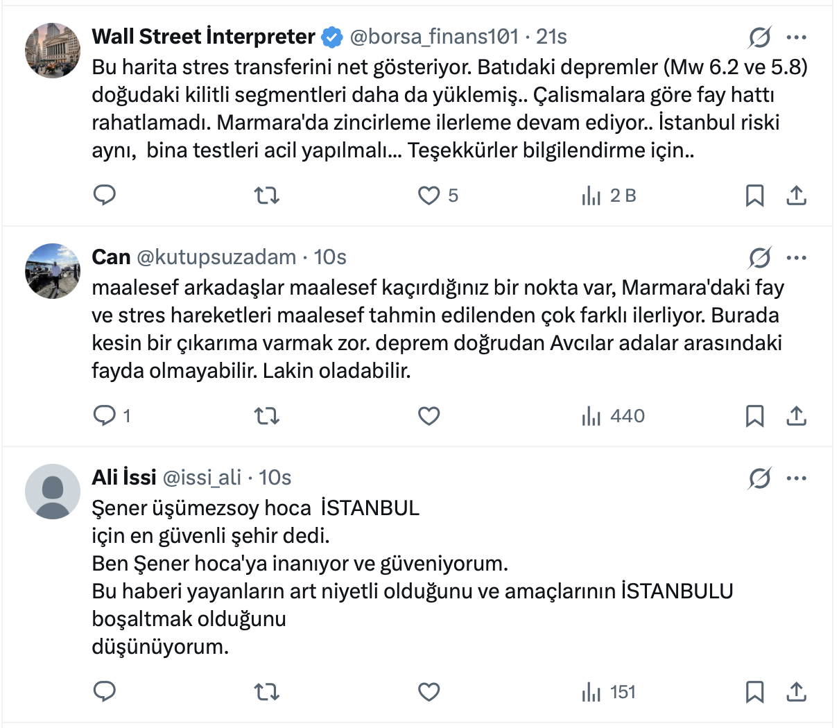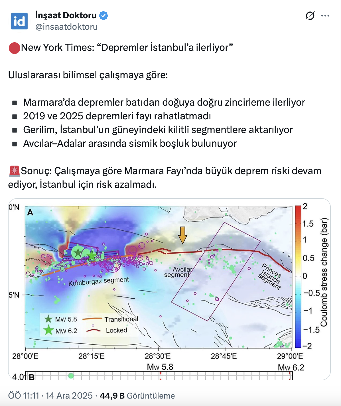 İnşaat Doktoru paylaşımında şu ifadeleri kullandı: “Uluslararası bilimsel çalışmaya göre Marmara’da depremler batıdan doğuya doğru zincirleme ilerliyor. 2019 ve 2025 depremleri fayı rahatlatmadı. Gerilim, İstanbul’un güneyindeki kilitli segmentlere aktarılıyor. Avcılar–Adalar arasında sismik boşluk bulunuyor