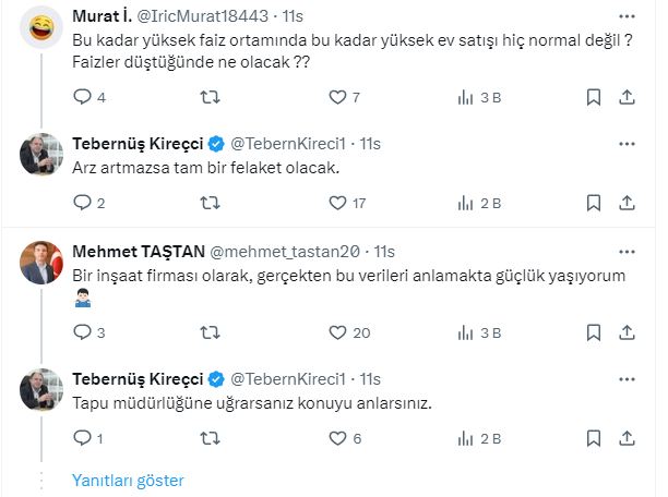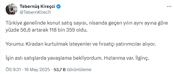 Tebernüş Kireçci, nisan 2025 konut satış rakamlarındaki artışla ilgili 'Hızlanma var. İlginç' yorumunu yaparak, bu konutları alanların kiradan kurtulmak isteyenler ve fırsatçı yatırımcılar olduğunu söyledi.