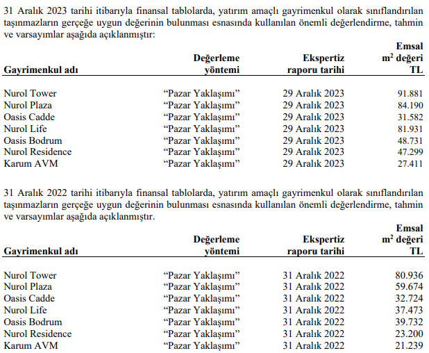 31 Aralık 2023 tarihi itibarıyla, yatırım amaçlı gayrimenkullerin gerçeğe uygun değeri aşağıdaki gibidir;
