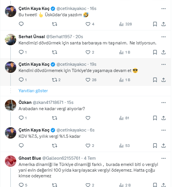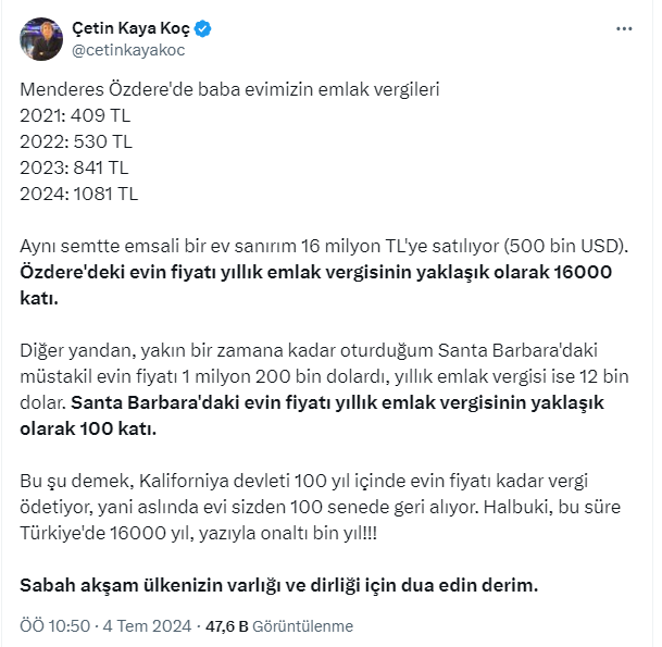 CHES Konferansı Kurucu Ortağı Çetin Kaya Koç sosyal medya hesabından İzmir Özderede'ki babasının evinin emlak vergilerini yıllara göre hesaplayarak, Türkiye'deki emlak vergileri ile Santa'daki vergilerini kıyasladı.