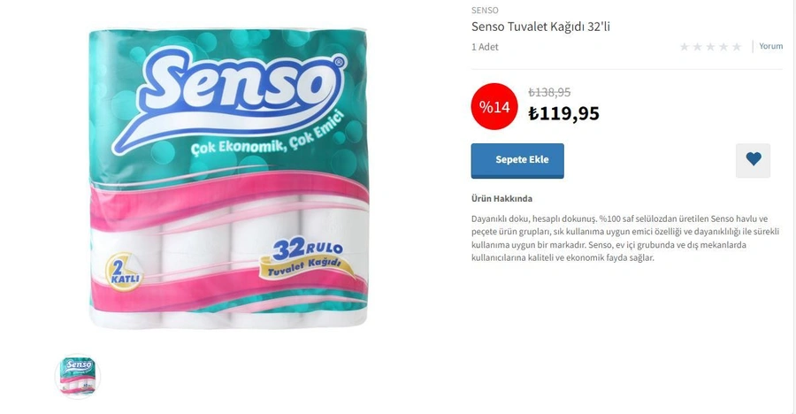 Mopaş, uygun fiyatlarıyla müşterilerine bu temel ihtiyacı karşılama fırsatı sunuyor. Tuvalet kağıdı alışverişi yapmak isteyenler, Mopaş mağazalarını ziyaret ederek bu büyük indirimden faydalanabilirler. Senso Tuvalet Kağıdı 32'li paket, sadece 119,95 TL'ye satışta.
